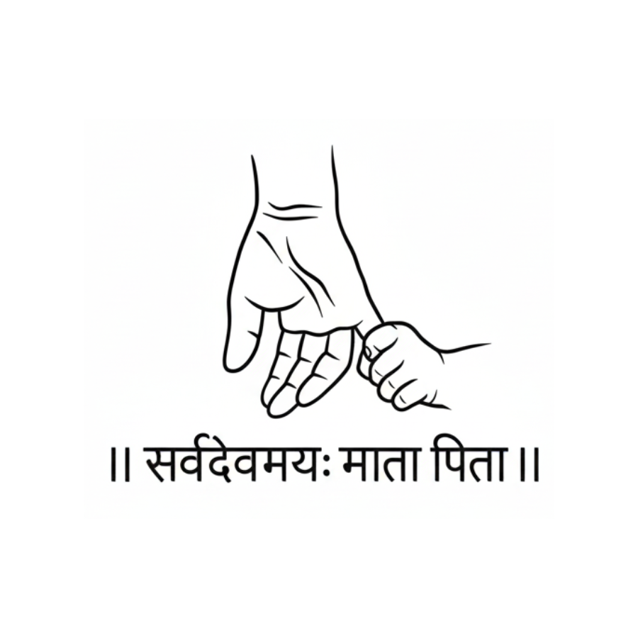 A soulful design honoring parents as divine blessings, featuring the Sanskrit phrase “सर्वदेवमयः माता पिता” with a tender hand-holding illustration. A powerful symbol of gratitude, protection, and unconditional love.